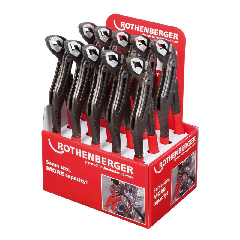 The water pump plier ROGRIP M can be used for clamping and rotating different pipe types up to Ø 2". The display includes 10 pliers.